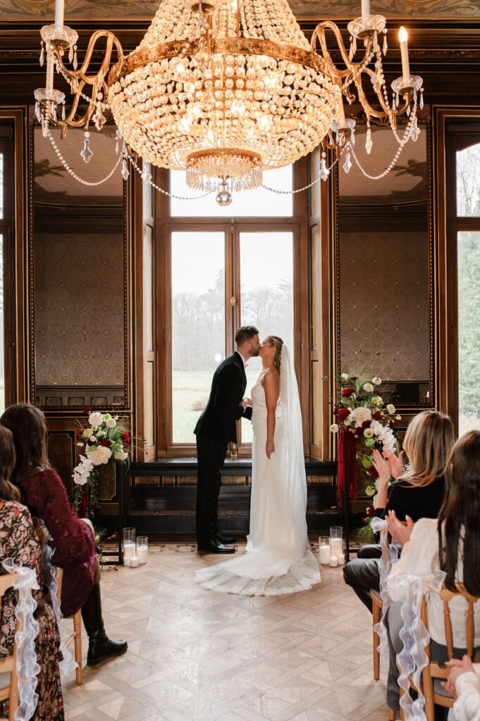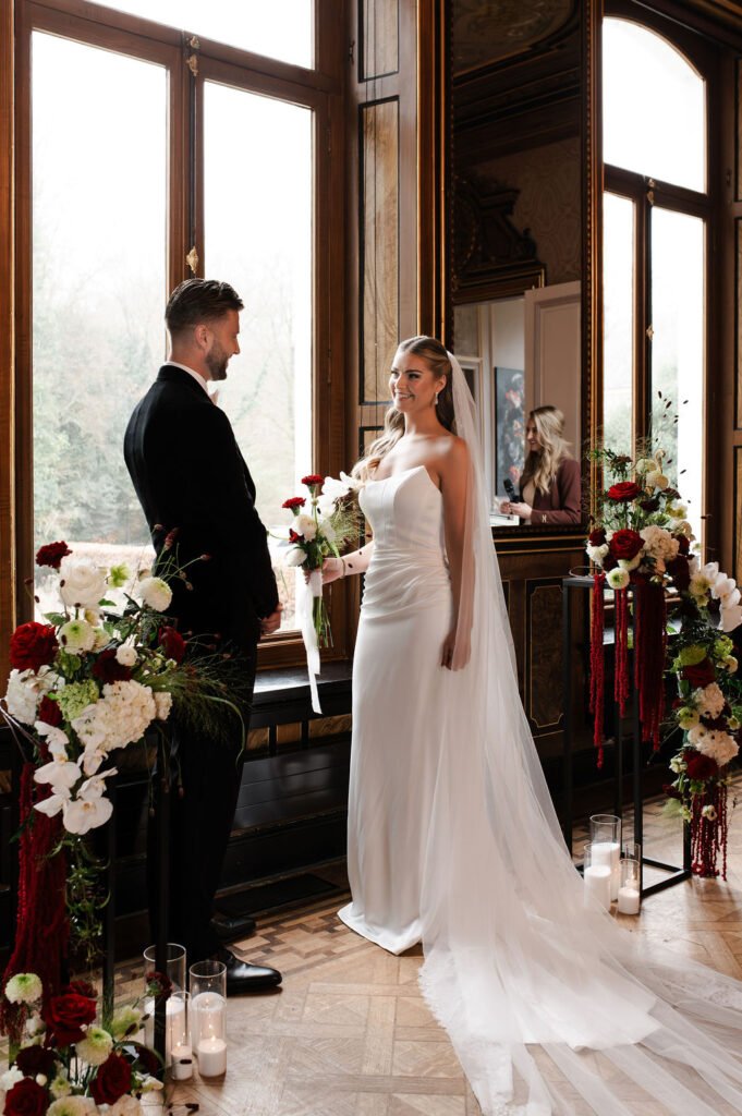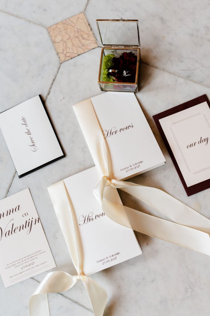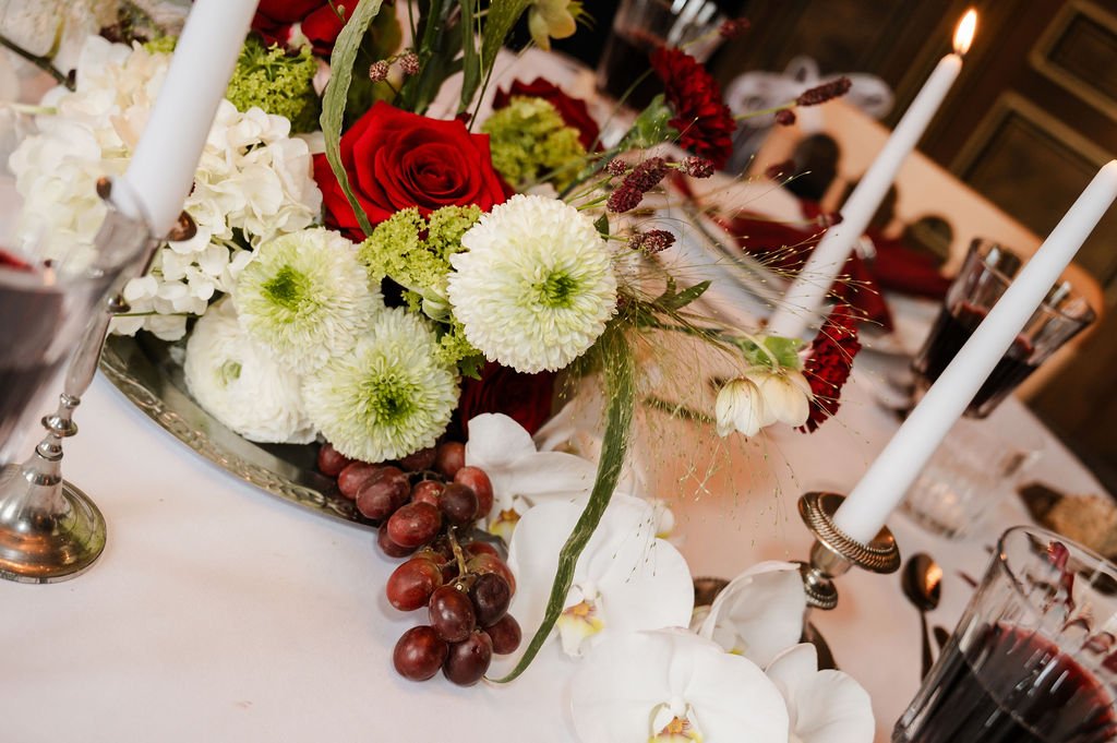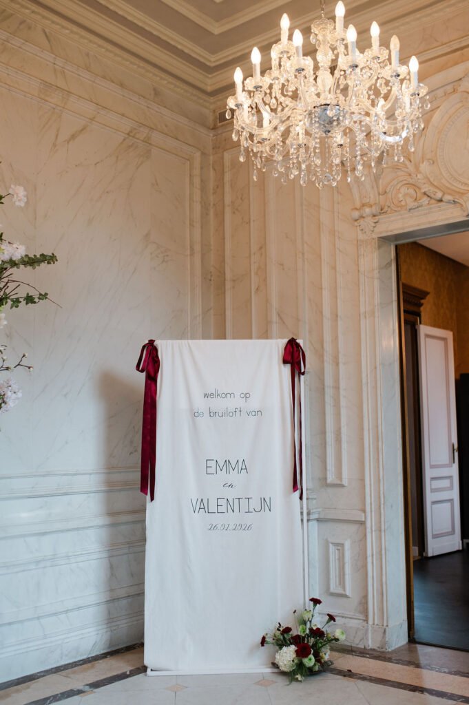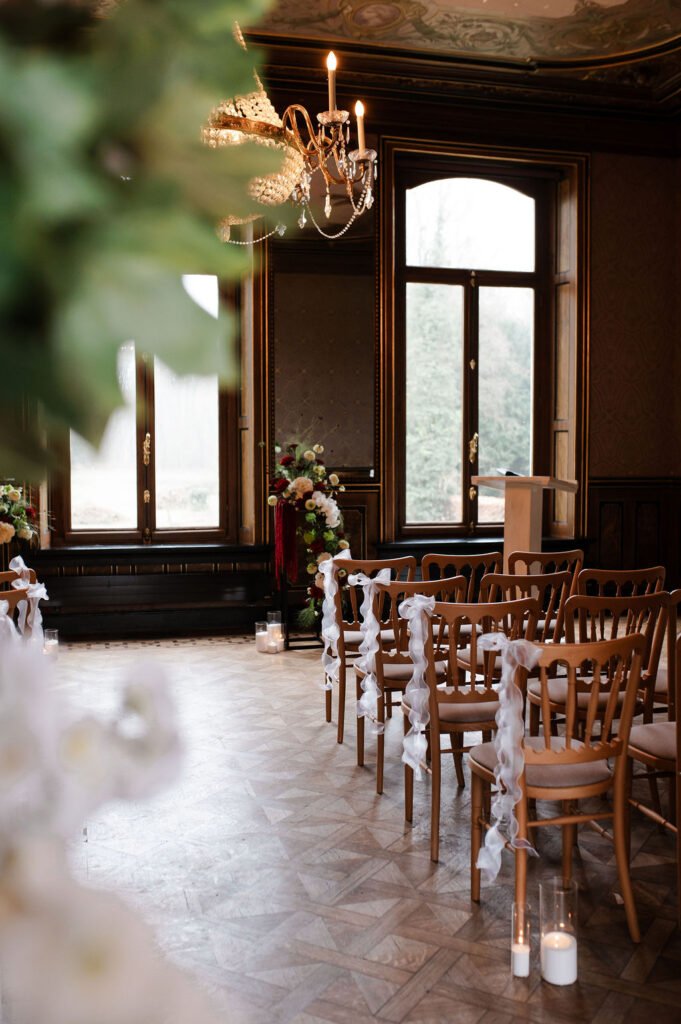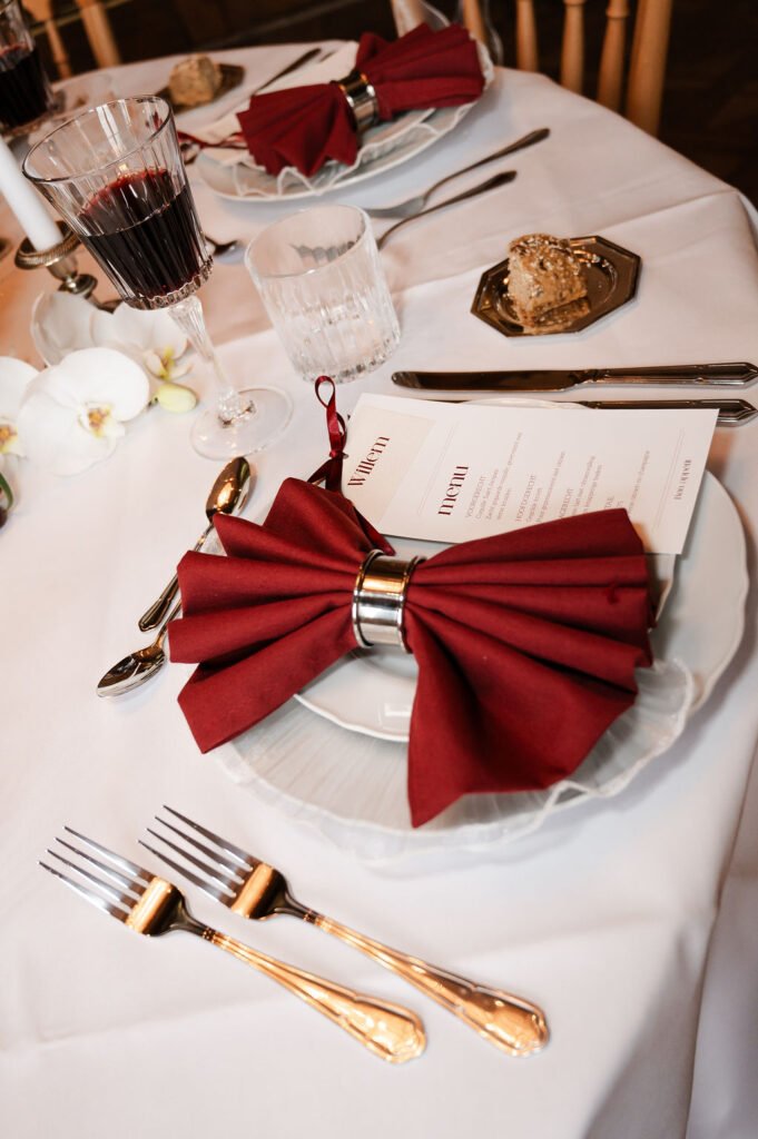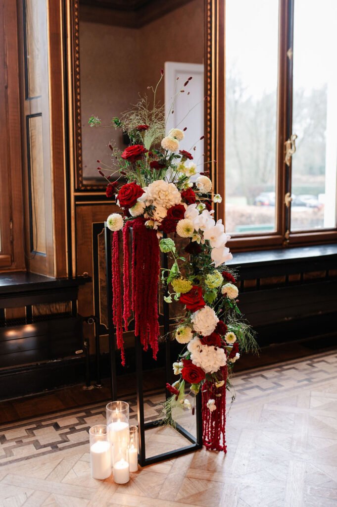 Voor deze shoot werkten we met bloemstukken die een belangrijk onderdeel van het geheel vormen: los, natuurlijk en met een mooie balans tussen diepe roodtinten en zachte, lichte bloemen. Van een speels stuk bij de ceremonie tot een rustigere vertaling in de dinersetting, waar zilveren details en een subtiele creatieve touch samenkomen. Alles sluit op elkaar aan zonder te overheersen.
