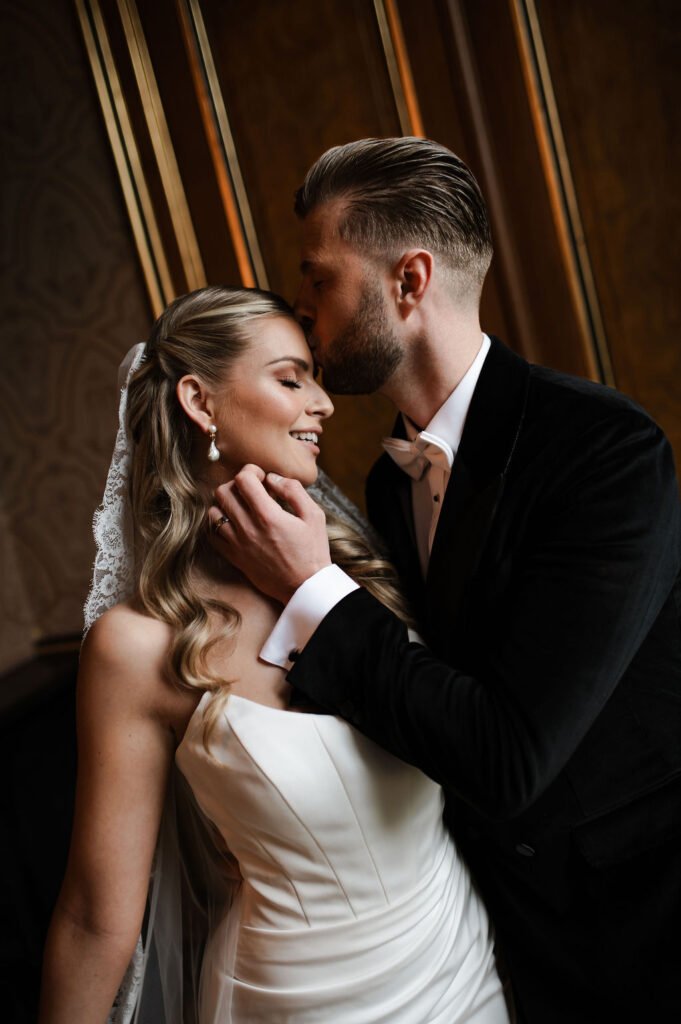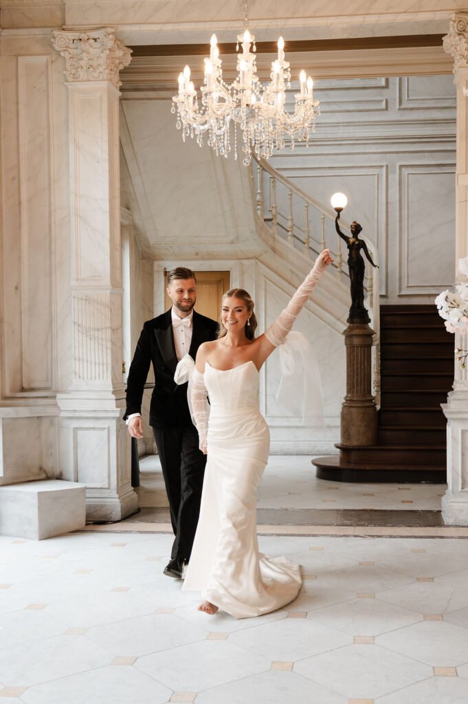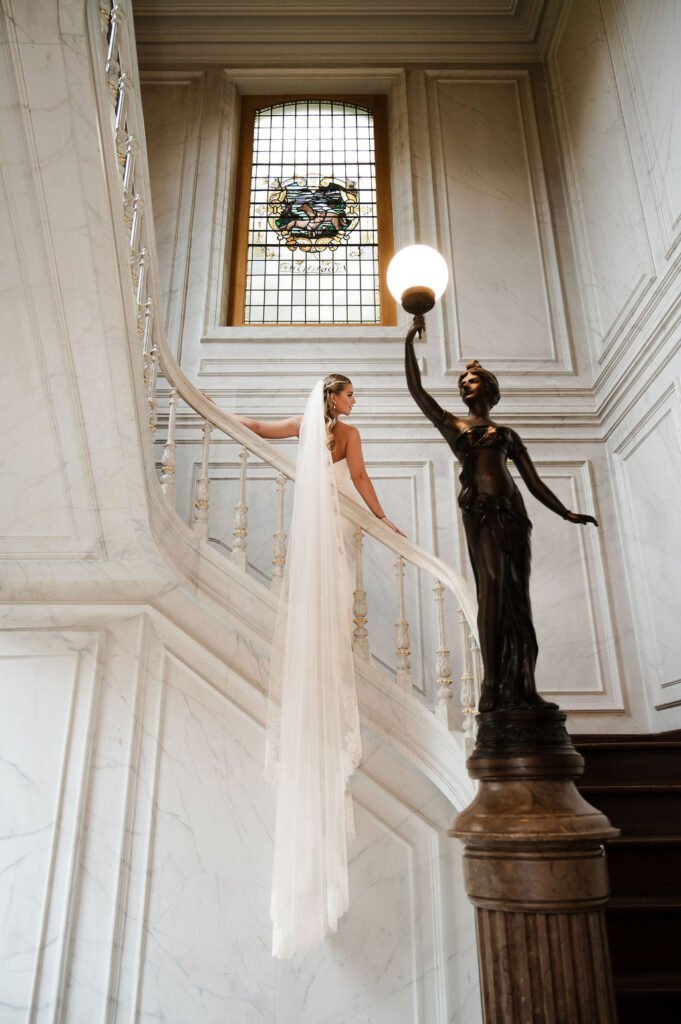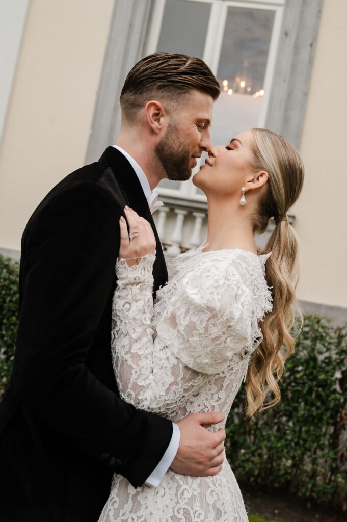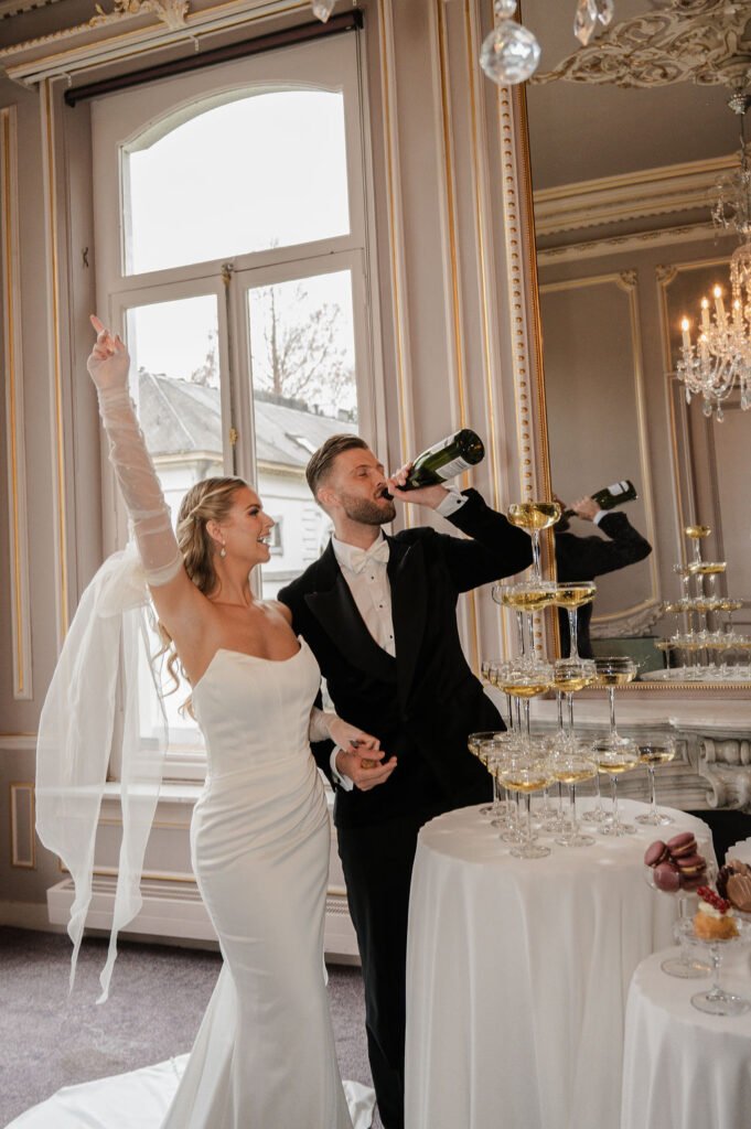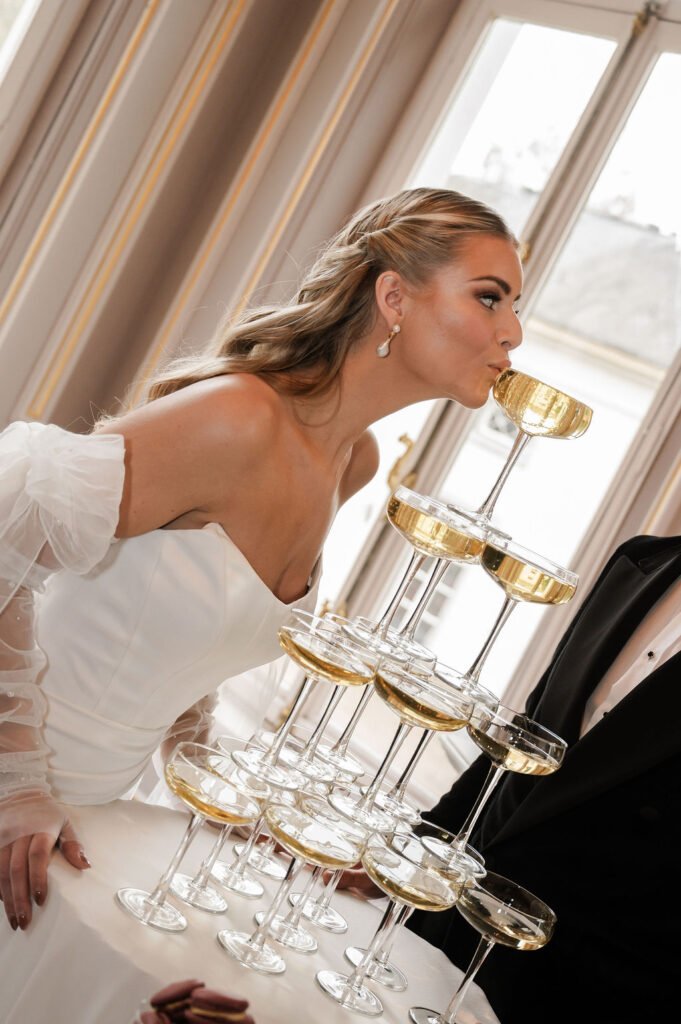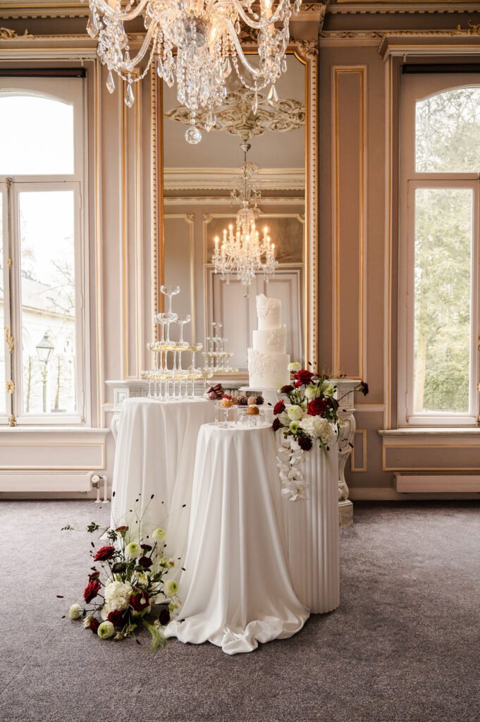 De bruid draagt twee verschillende jurken, passend bij de verschillende momenten van de dag, aangevuld met bijpassende accessoires. Dit zorgt voor een fijne afwisseling in beeld en sfeer. De champagne toren geeft een speels en feestelijk moment aan het geheel. Voor deze shoot verzorgden wij de planning, styling en het bloemwerk, waarbij alles rustig en in balans samenkomt.